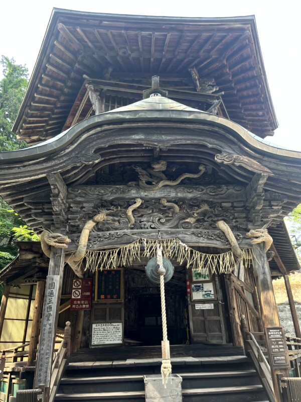 さざえ堂は二重らせん構造で、通路が上り下りでわかれる設計になっている。すれ違わずスムーズに参拝できる配慮とのこと。